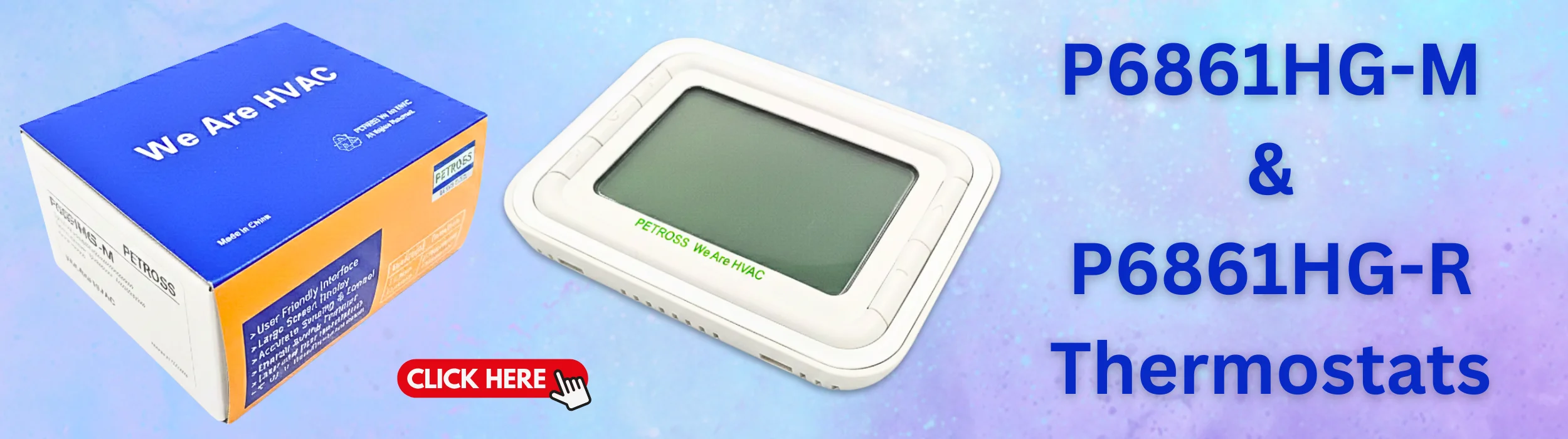 The PETROSS P6865HG-M and P6865HG-R are horizontal thermostat models within the P6865 series, which are designed for 3-speed fan coil units with 24VAC power supply. Both feature a horizontal, large green LCD display with a white housing.