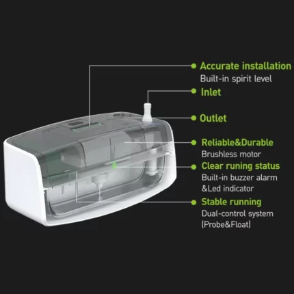Adopting a brushless motor, dirt-resistant high-power centrifugal water pump, built-in safety switch, and dual control level sensor (probe and float) ensures that the product can operate reliably for a long time and safely discharge condensate.